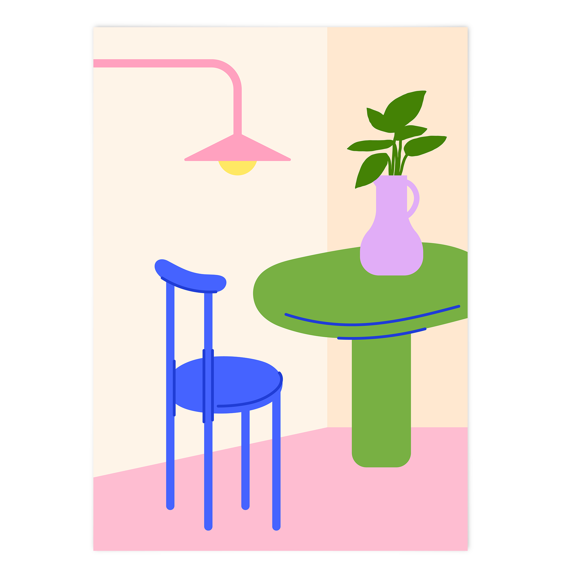 A pop of pastel meets Bauhaus charm: This poster showcases a vivid scene with a green table as its central element. On top stands a lilac-colored vase holding a lush green plant, while a soft pink wall lamp and a blue chair complete the composition. The palette plays with contrast and calm, creating a stylish and contemporary art piece for your space.