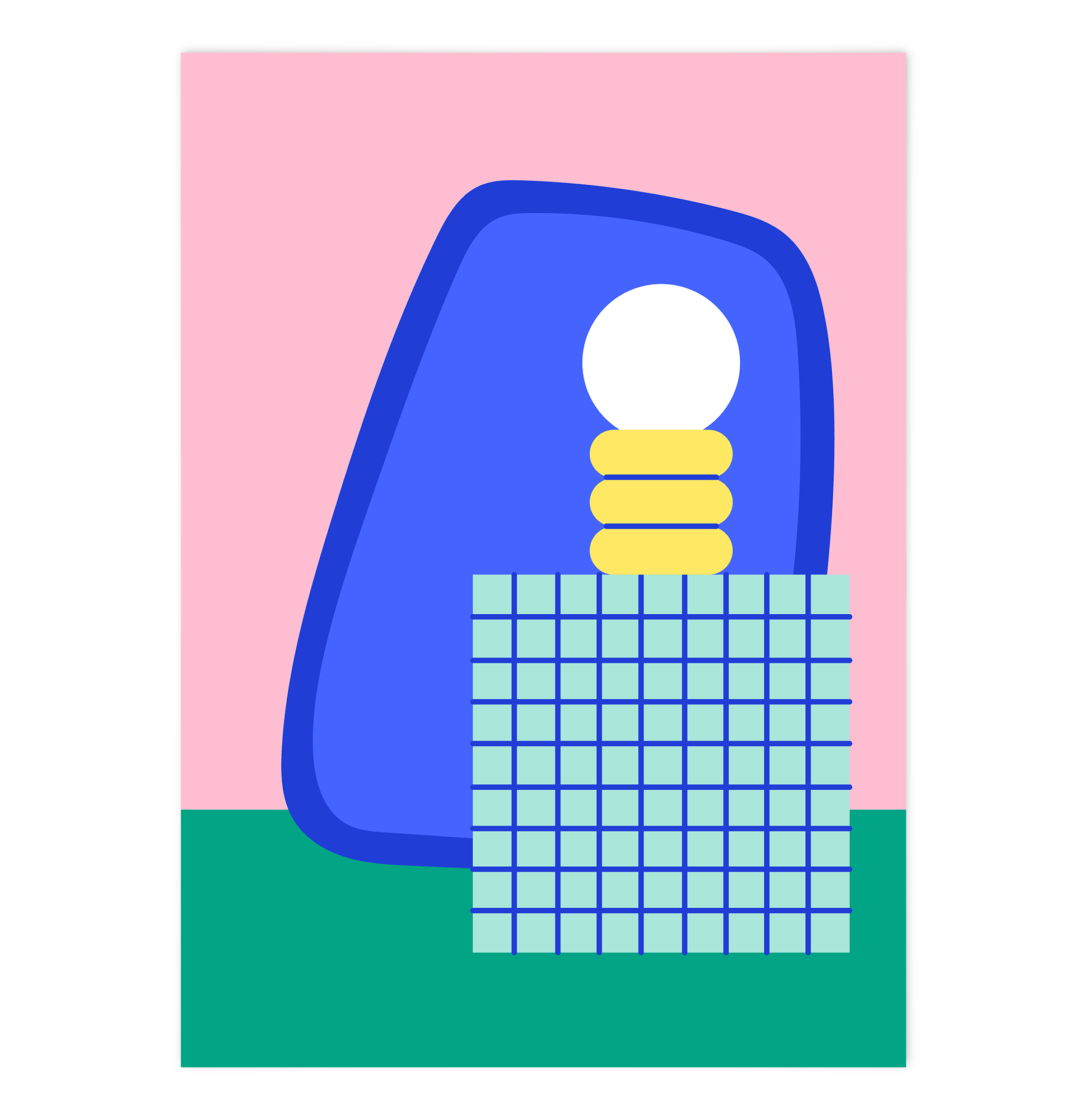 Fresh tones and bold design: This poster features a chunky tiled block table with a yellow lamp and oversized white bulb as its centerpiece. The floor glows in vibrant green, while the background fades between pink and blue hues. A playful yet minimalist composition full of contrast and Bauhaus-inspired calm.