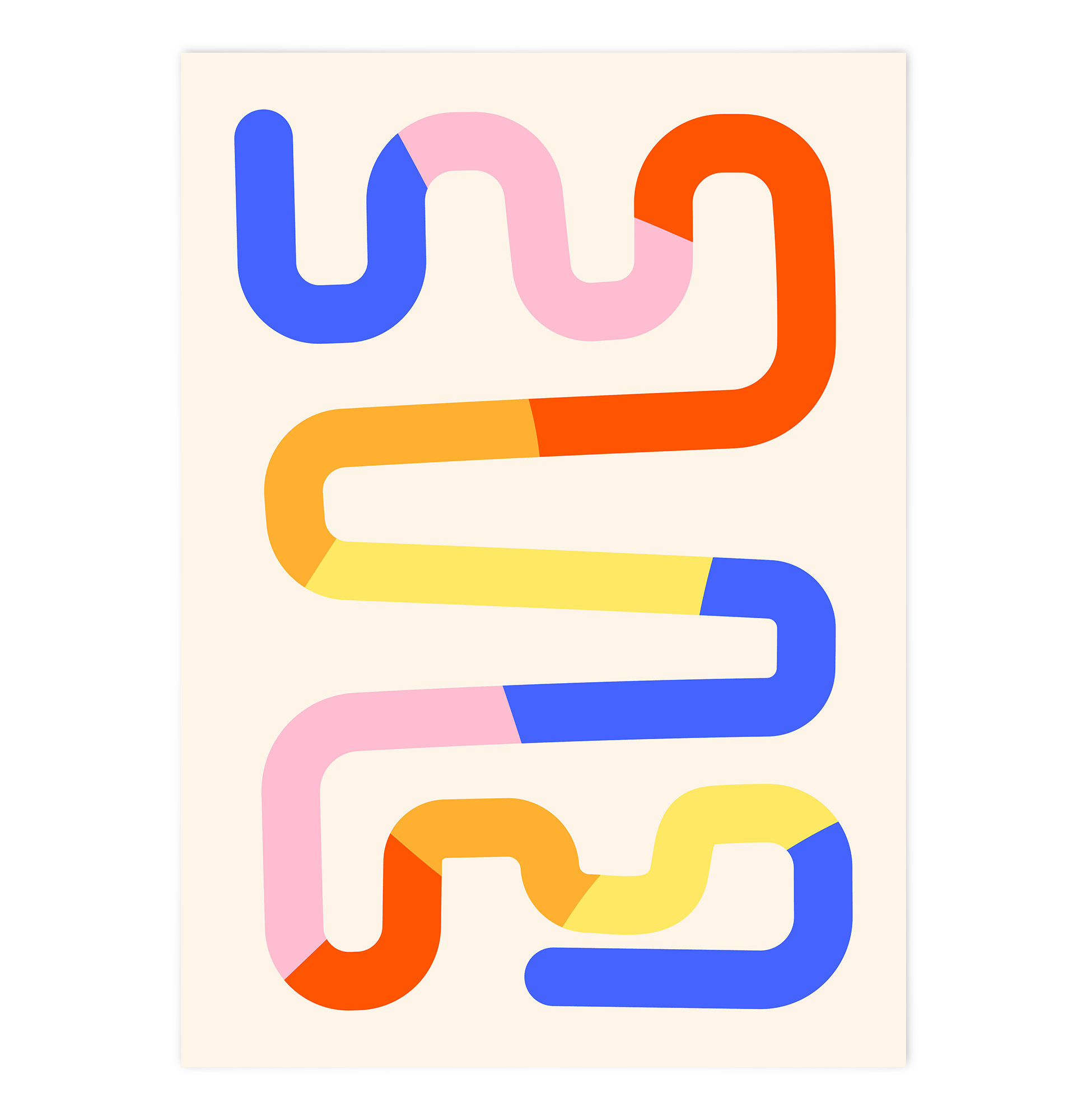 Curved and angled lines in yellow, ochre, orange, blue and soft pink flow across a beige canvas in rhythmic harmony. The abstract composition evokes motion and balance, bringing Bauhaus-inspired energy to modern interiors, creative studios or curated gallery walls.