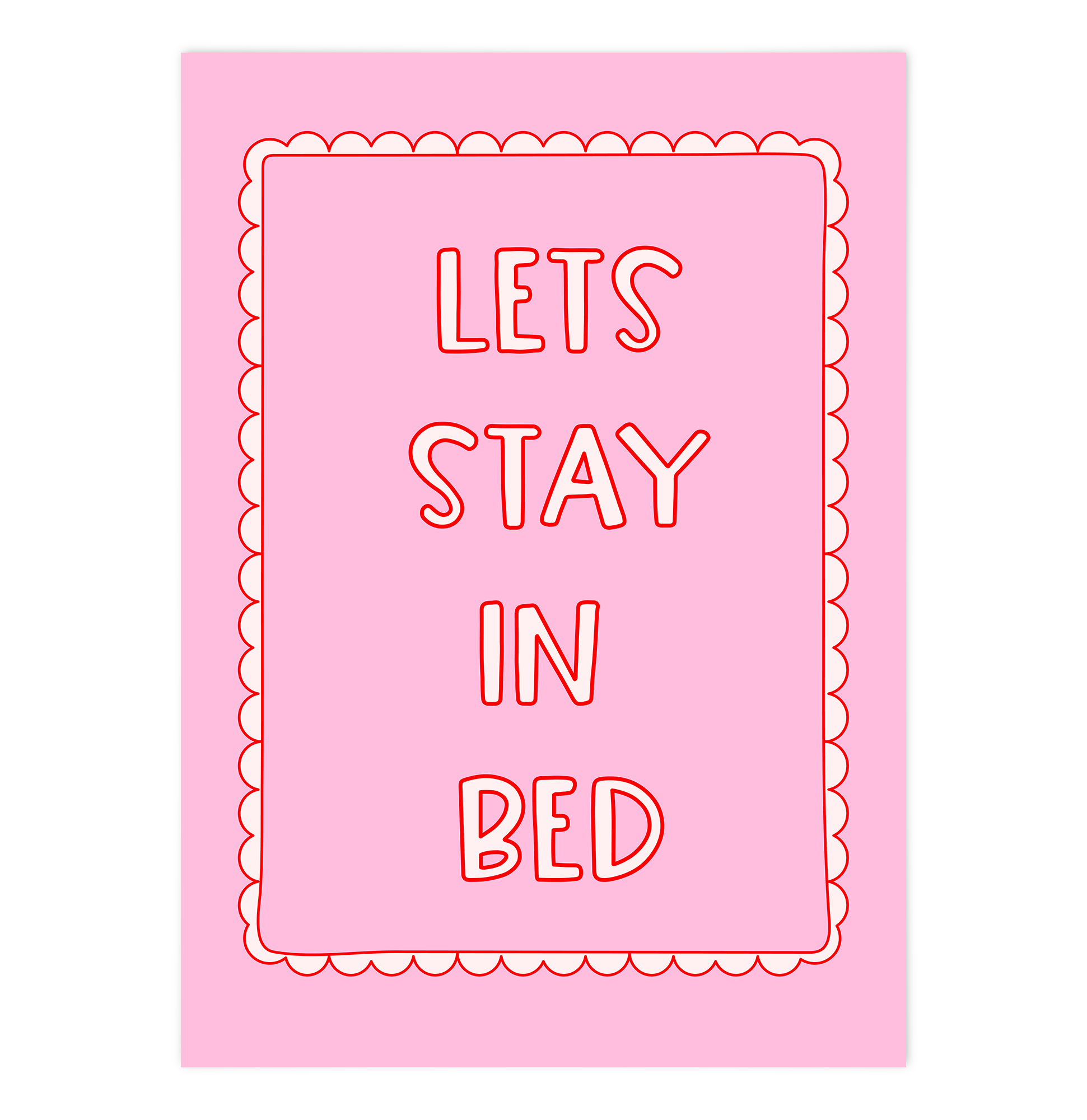 This inviting print whispers the sweetest suggestion: 'Let's stay in Bed.' It captures those perfect moments when the outside world can wait, and all that matters is the warmth, comfort, and connection found between soft sheets and loving arms.