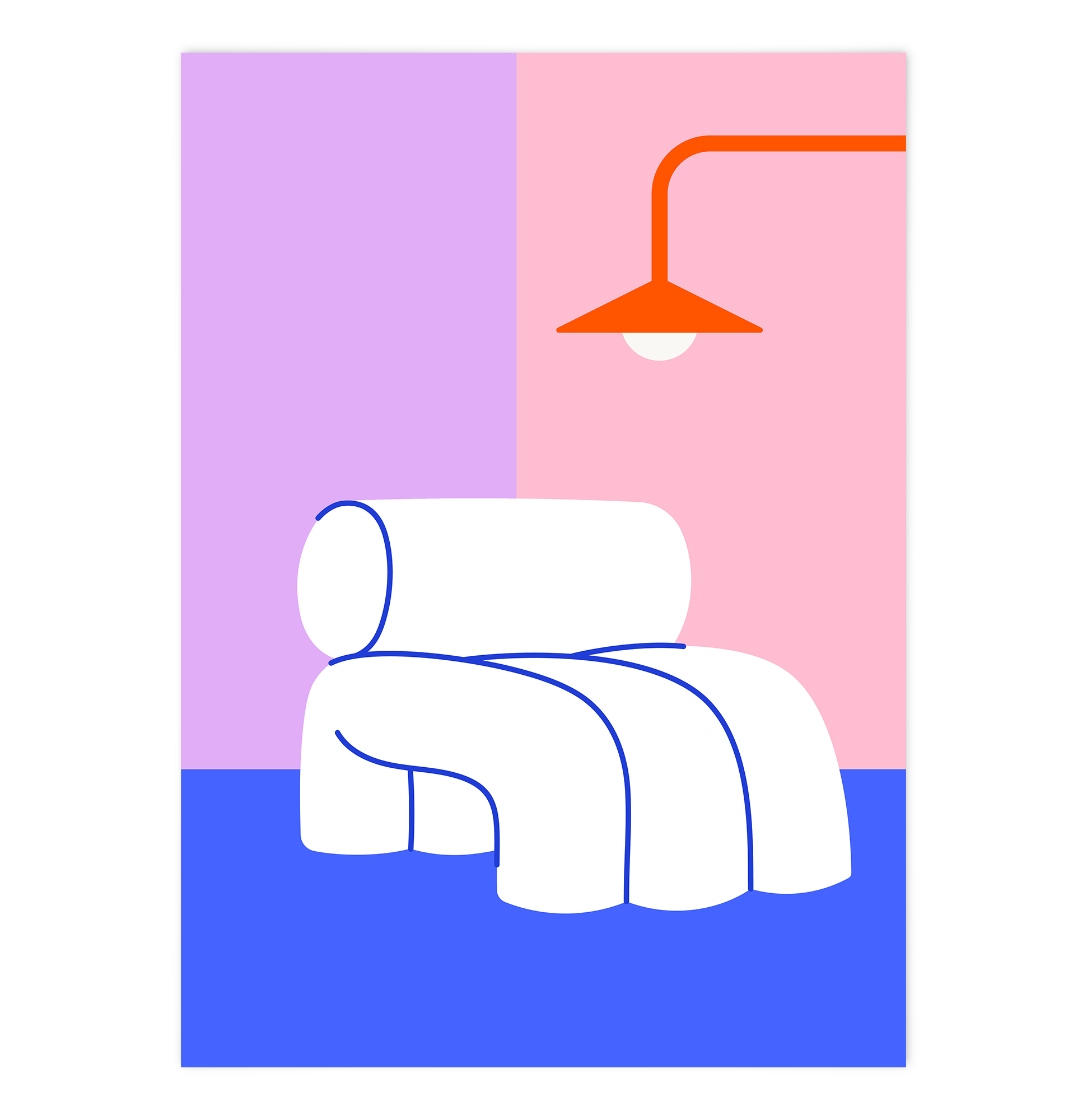 Retro-futuristic and full of charm: This poster features a wide, light-colored lounge chair resting on a vibrant blue floor. A warm orange wall lamp adds glow, set against layered lilac and pink tones in the background. The scene blends soft geometry with bold color – a modern nod to Space Age design with Bauhaus spirit.